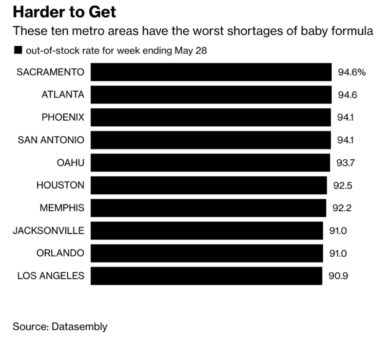 在美国,6个月以上婴儿中有75%以吃奶粉为主。数据显示,全美婴儿配方奶粉平均缺货率一度上升至74%,其中14个州的缺货率达到90%甚至更高。5月22日,美国纽约市市长宣布,该市因婴儿配方奶粉供应短缺进入紧急状态。