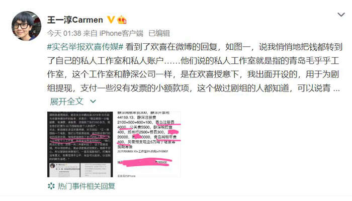 14日凌晨,王一淳再次作出回应,称私人工作室是在欢喜授意下出面开设的,用于为剧组提现,支付一些没有发票的小额款项,并晒出项目筹备阶段的报销清单,“真没想到他们会用这个反咬一口”,表示欢喜传媒“不仅知情,而且是授意、受益”。