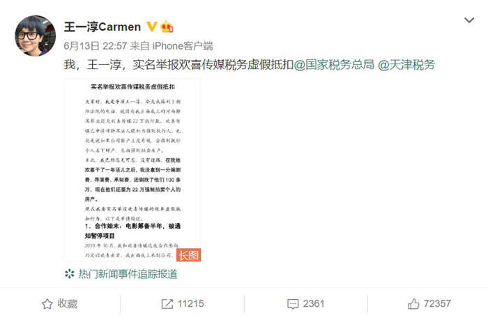 中新文娱北京6月15日电(记者 任思雨)“我,王一淳,实名举报欢喜传媒税务虚假抵扣。”6月13日深夜,导演王一淳在微博发布控诉欢喜传媒长文,一时引起热议。