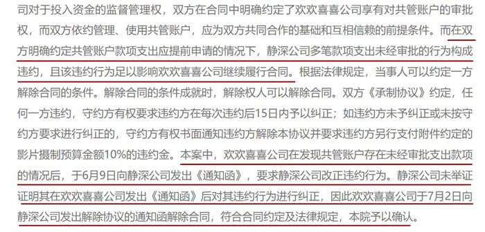 法院认为,在双方明确约定共管账户款项支出应提前申请的情况下,静深公司多笔款项支出未经审批的行为构成违约,欢欢喜喜公司发出解除协议,符合合同约定及法律规定。