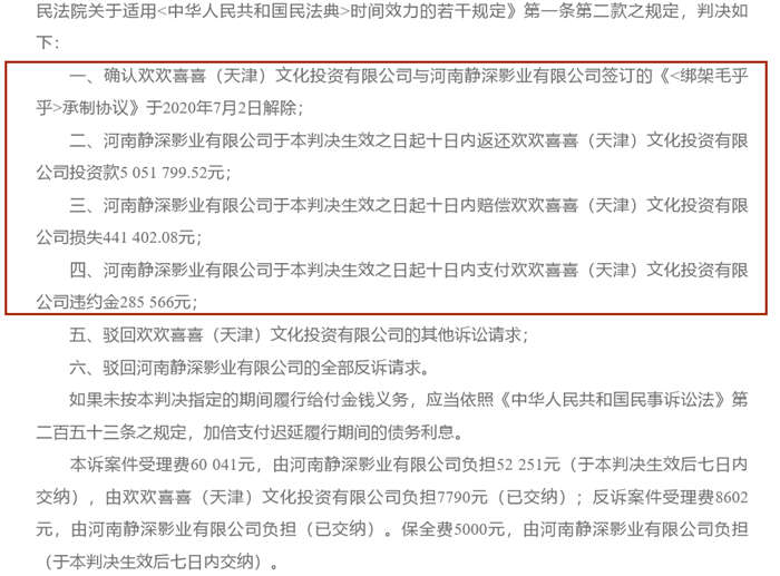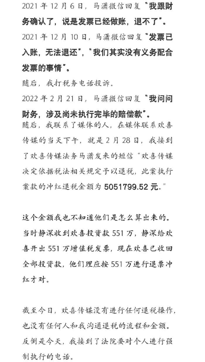 “我们就跟她说,你这样不规范,我们就不投了,你把剩下的钱还给我们,她不同意。我们就去打官司,法院一判二判都判定了,这个是她违规,所以项目停止,她必须把钱还给我们。她很不甘心,所以就到处抹黑我们,一直在威胁我们。”欢喜传媒方补充表示,税务问题欢迎来查。
