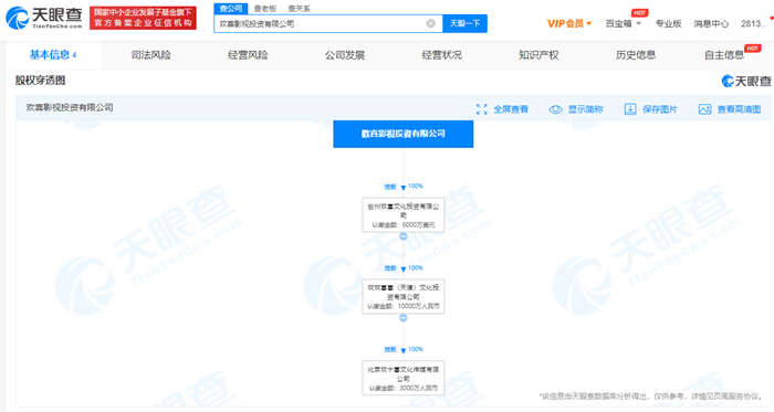 天眼查App显示,欢喜影视投资公司直接或间接全资持股台州欢喜文化投资有限公司、欢欢喜喜(天津)文化投资有限公司、北京欢十喜文化传媒有限公司3家公司。其中,欢欢喜喜公司就是与导演王一淳及河南静深影业等签订影片合同的公司。