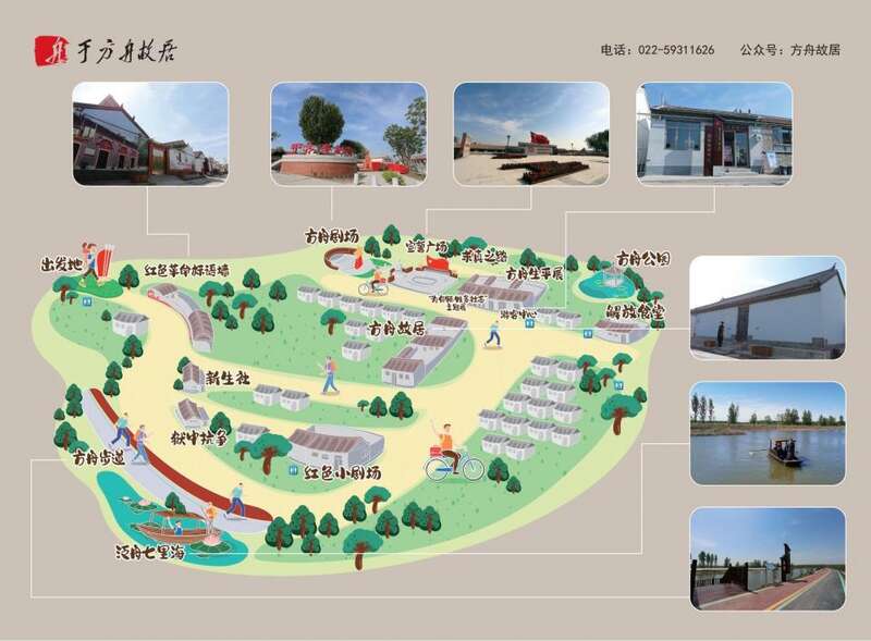 方舟步道全长1000米,宽3米,在革命动荡年代,于方舟、周恩来、邓颖超和郭隆真等爱国学生曾泛舟七里海、探索救亡图存道路;于方舟标语墙绘包括12幅红色革命标语墙绘,鲜明展现了于方舟烈士献身革命,救国救民于水火的赤子之心和挽救中华民族危亡的奋斗历程;宣誓广场的西侧为于方舟烈士塑像,他凝视远方,坚毅不屈,仿佛看到了自己为之奋斗献身的伟大事业;广场北侧矗立鲜艳的党旗雕塑,下方为庄严的入党誓词和入团誓词;广场东侧为求真之路的主题雕塑。