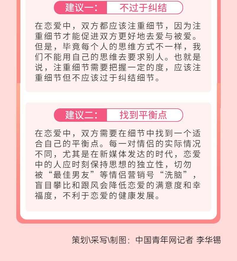 他建议,在恋爱中,双方需要在细节中找到一个适合自己的平衡点。每一对情侣的实际情况不同,尤其是在新媒体发达的时代,恋爱中的人应时刻保持思想的独立性,切勿被“最佳男友”等情侣营销号“洗脑”,盲目攀比和跟风会降低恋爱的满意度和幸福度,不利于恋爱的健康发展。