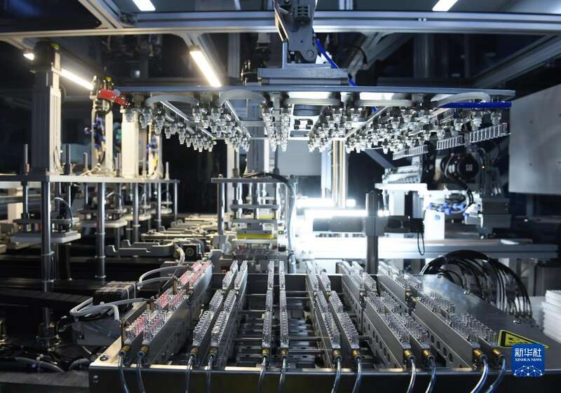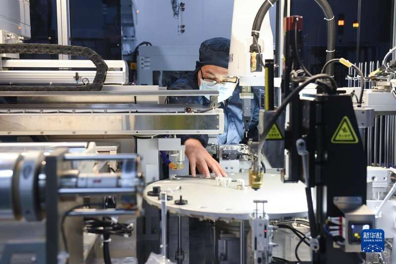 6月15日,在仙居县一家医疗器械公司的生产车间,自动机械臂在装配医疗器械。