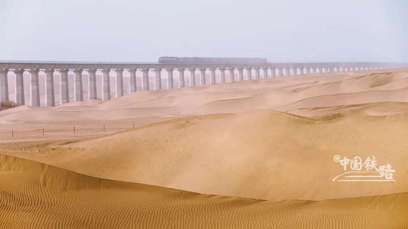 自2018年12月开工建设以来,国铁集团组织参建单位根据沙漠地质特点,采取措施攻坚克难,确保工程如期建成。针对部分区段风沙大、沙丘动态迁移容易掩埋线路的问题,建设单位采取以桥代路方式,建成总长达49.7公里的过沙桥5座,让风沙从桥下穿过,大幅降低风沙对线路的侵害威胁;同时,修建草方格5000万平方米,种植梭梭、红柳、沙棘等灌木和乔木1300万株,形成防沙护路的绿色屏障。