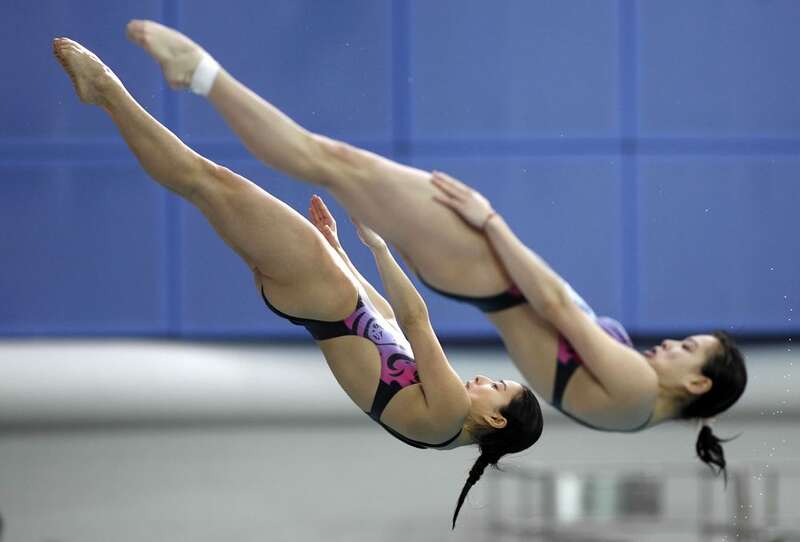 郭晶晶(后)/吴敏霞在比赛中(资料图)。新华社记者费茂华摄