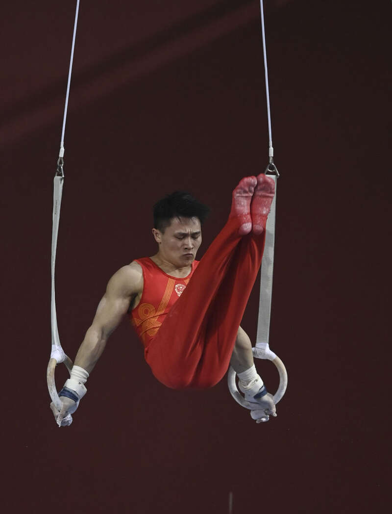 6月15日,兰星宇在吊环比赛中。当日,在卡塔尔首都多哈举行的第9届亚洲体操锦标赛暨2022年(亚洲区)世界体操锦标赛资格赛吊环项目预赛中,中国选手兰星宇以14.900分排名第一,晋级决赛。新华社发(尼库摄)