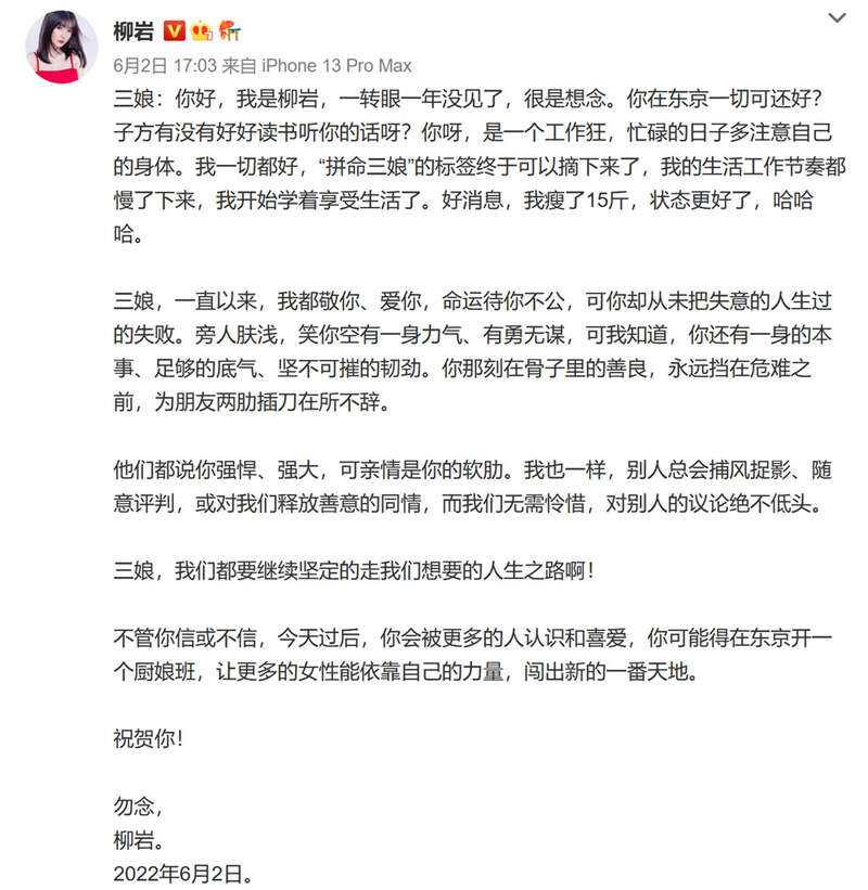 《梦华录》开播时,柳岩给“孙三娘”写了一封信。她写道,“我一切都好,‘拼命三娘’的标签终于可以摘下来了,我的生活工作节奏都慢了下来,我开始学着享受生活了”;也写道,“别人总会捕风捉影、随意评判,或对我们释放善意的同情,而我们无需怜惜,对别人的议论绝不低头。”