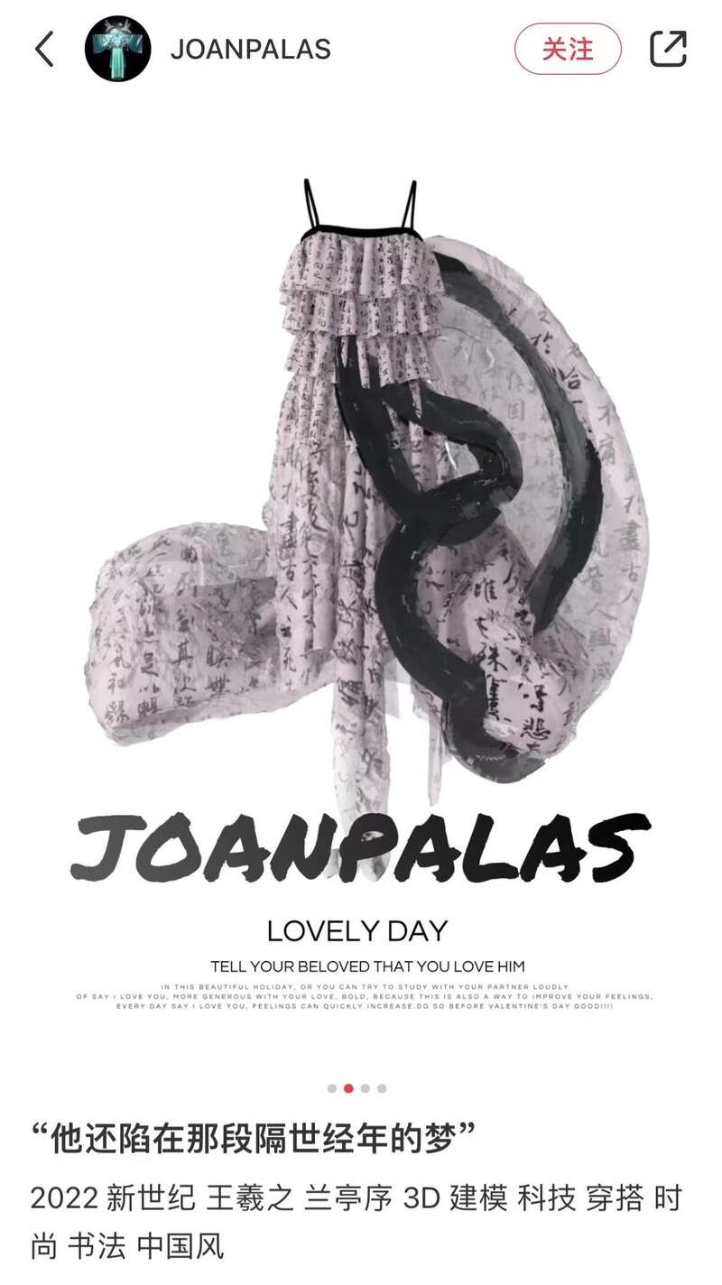 相比Tribute Brand的“平价”路线,另一虚拟时装品牌The Fabricant走的就是“奢侈”路线,其推出的一款名为“彩虹色”(Iridescence)的裙装卖出了9500美金。目前国内也有了这样的虚拟时装品牌,Joanpalas在小红书上有2.8万粉丝,其产品灵感来源包括《山海经》和王羲之的书法。这些虚拟时装大多勾勒出清晰的身材线条,并且外观采用看起来像水、雾气或是金属等现实生活中不太可能用来制作服装的材料。