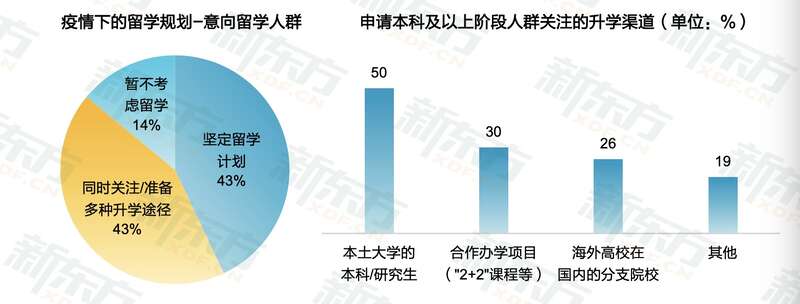 疫情也促使意向留学人群的学业规划更多样化,仍坚定留学计划,以及同时关注多种升学途径、进行两手准备的群体占比均达到43%。在申请本科及以上阶段的意向群体中,不少人会考虑中外合作办学项目、海外高校在国内的分支院校等其他与国际教育相关的升学途径。