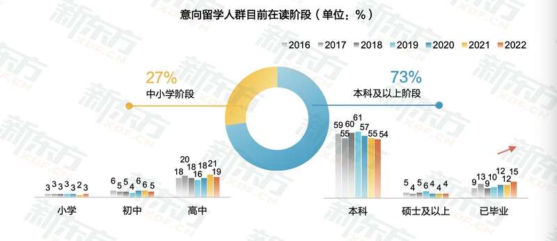 白皮书显示,73%的意向留学人群处于本科及以上阶段,27%处于中小学阶段。其中,毕业后再计划留学的意向人群所占比例逐渐攀升,从2016年的9%增至2022年的15%,“更多的职场人士通过提升学历背景来增强自己的就业竞争力”。