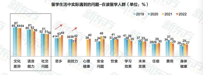 白皮书显示,文化差异、语言能力、社交问题仍为困扰留学生的三大问题,但留学生对此的担心程度较往年有所下降,这和中国学生增长的民族自信与优异的语言成绩有关。不过,由于各国边境开放政策的不同,海外留学生思乡的情绪更加强烈,且部分留学时仍在上网课,需要强大的自控力督促自己更好地完成学业,因此留学时对自控力的担忧上升。