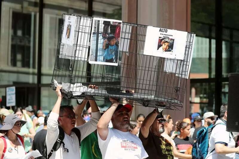 图为2018年6月30日,人们在芝加哥参加反对移民执法政策集会。美国政府4月推出“零容忍”的强硬移民执法政策,规定所有成年非法入境者被捕后将一律面临拘押和起诉,他们的子女则被安置在其他地点,造成“骨肉分离”。6月底,美国多座城市举行700多场集会,要求边境执法人员结束“骨肉分离”式执法,使分离的家庭尽快团聚。新华社记者 汪平 摄