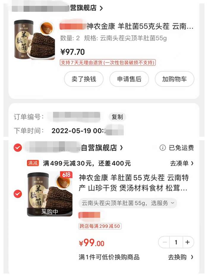 还有消费者给中新财经提供的订单记录显示,5月19日在某电商平台上购买的羊肚菌,显示每盒单价是97.7元,买了2盒,领了20元优惠券后,共消费175.4元。在6月16日同一商家同一产品显示单价是99元,还没有了20元优惠券,即便也可减去20元优惠,同样买2盒也需要消费178元。