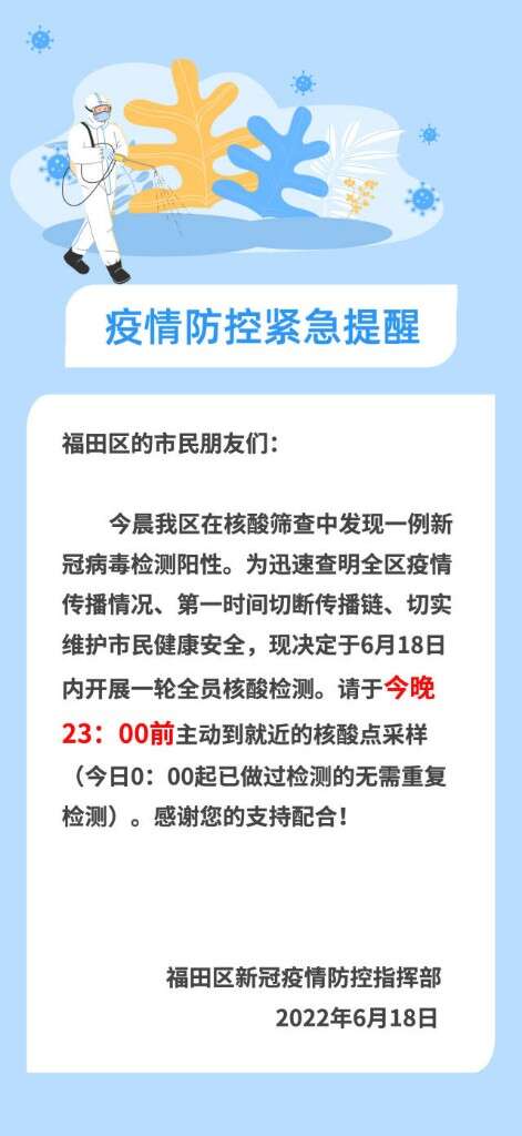 中国青年报客户端深圳6月18日电(中青报·中青网记者 武欣中)6月18日,深圳市福田区新冠疫情防控指挥部发布疫情防控提醒通知:6月18日清晨,福田区在核酸筛查中发现一例新冠病毒检测阳性人员。