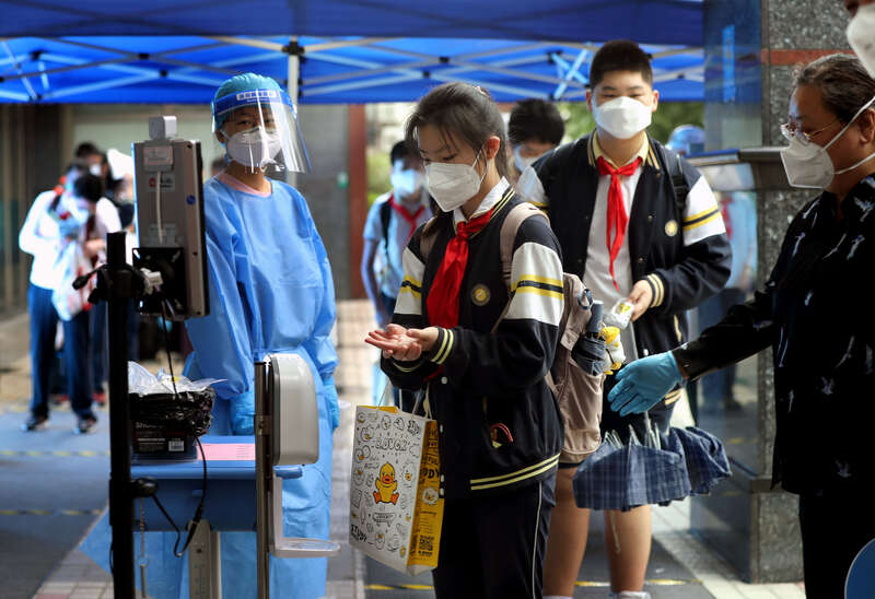 6月13日,上海市格致初级中学的初三学生在入校时进行手部消毒。当日,上海全市初三年级学生返校复学。新华社记者 刘颖 摄