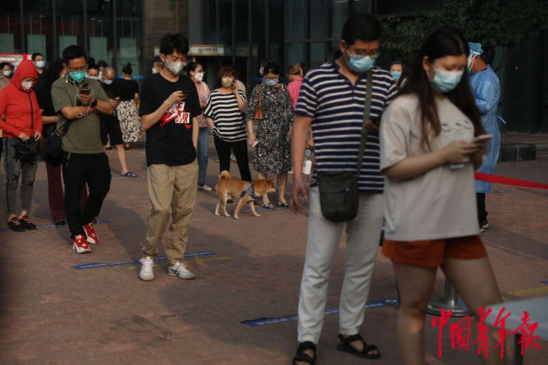 6月13日傍晚,北京市朝阳区一处核酸检测点前排起长队。6月16日,在北京市新型冠状病毒肺炎疫情防控工作第367场新闻发布会上,朝阳区副区长孟锐介绍,6月16日0时至15时,朝阳区新增新冠肺炎病毒感染者11名,截至目前,涉天堂超市酒吧疫情新增密接1638人(含同时空)。据朝阳区防控办消息,朝阳区分别于6月13-15日、6月16-18日连续开展全域核酸筛查。中青报·中青网记者 孔斯琪/摄