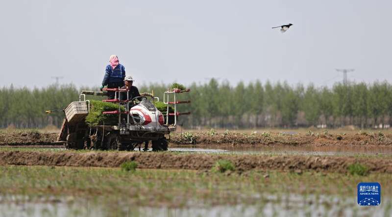 5月16日,辽宁省鞍山市台安县达牛镇贾家村村民驾驶插秧机插秧。新华社记者 姚剑锋 摄
