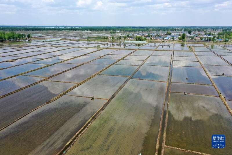 5月16日,辽宁省鞍山市台安县富家镇城子村村民操作插秧机插秧(无人机照片)。新华社记者 姚剑锋 摄