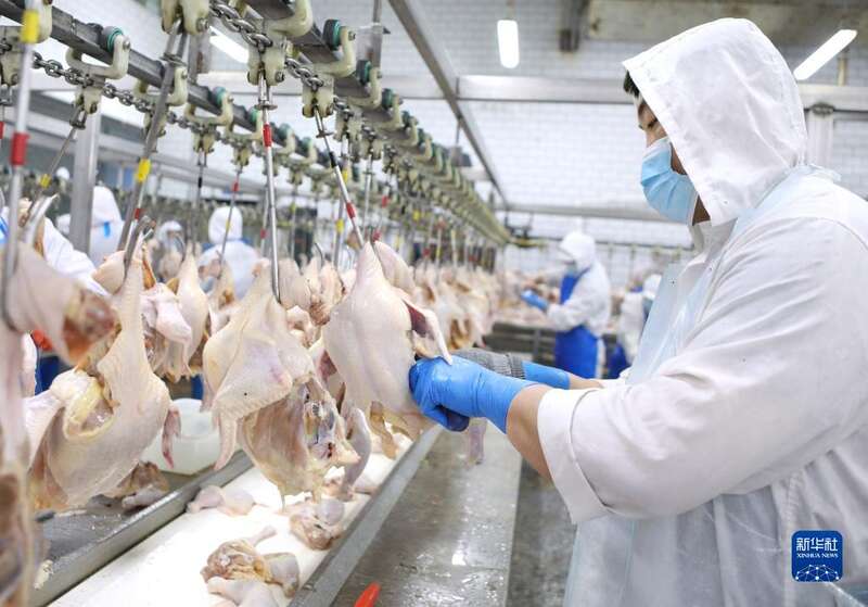 4月21日,工人在辽宁省鞍山市台安县一家食品有限责任公司白羽鸡加工流水线上工作。新华社记者 王乙杰 摄