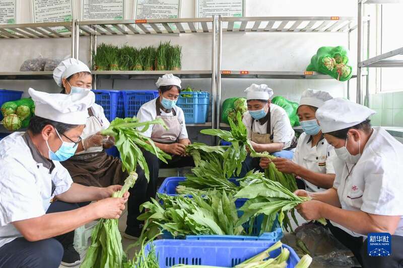 6月18日,在位于内蒙古呼和浩特市和林格尔县的内蒙古师范大学(盛乐校区)学生餐厅,餐厅工作人员在准备蔬菜。