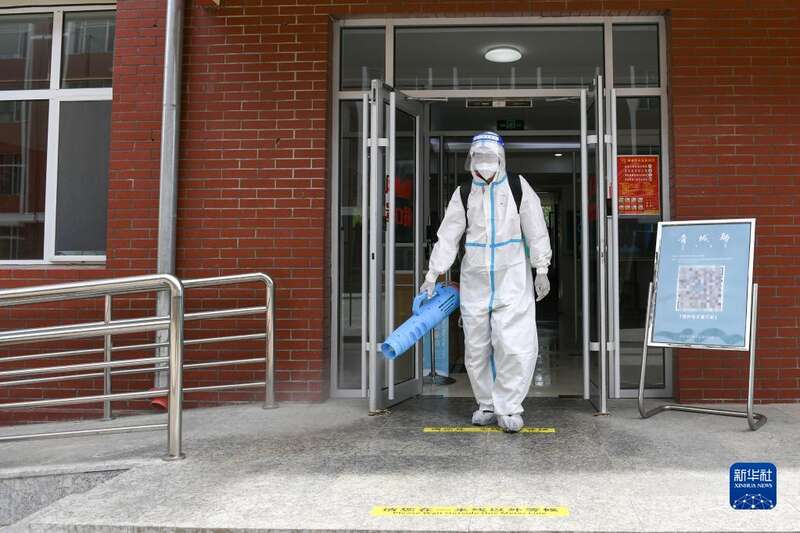 6月18日,在位于内蒙古呼和浩特市和林格尔县的内蒙古师范大学(盛乐校区)学生公寓外,学校工作人员在进行消杀。