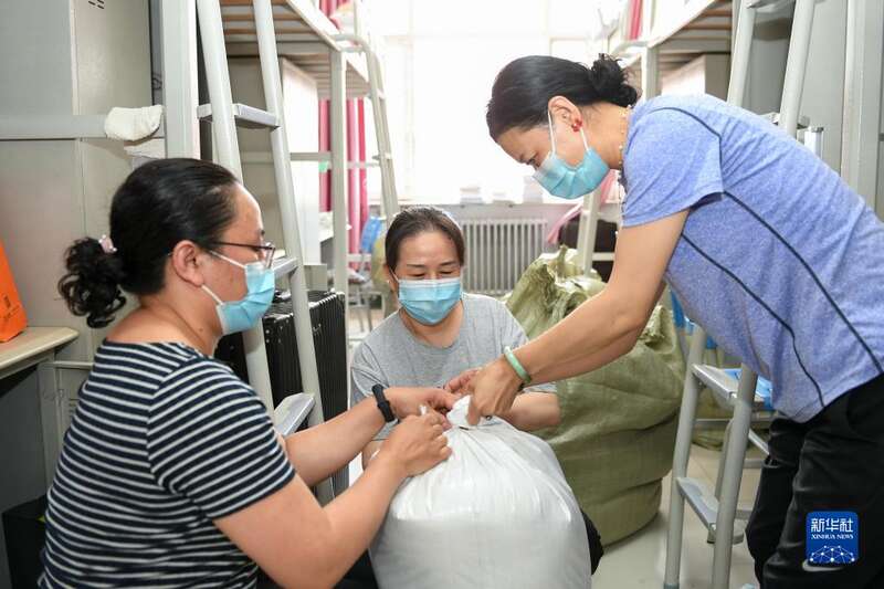 6月18日,在位于内蒙古呼和浩特市和林格尔县的内蒙古师范大学(盛乐校区)学生公寓,外国语学院的教师们为无法返校的毕业生打包行李。
