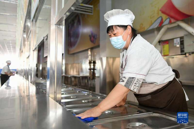 6月18日,在位于呼和浩特市和林格尔县的内蒙古师范大学(盛乐校区)学生餐厅,餐厅工作人员在打扫卫生。