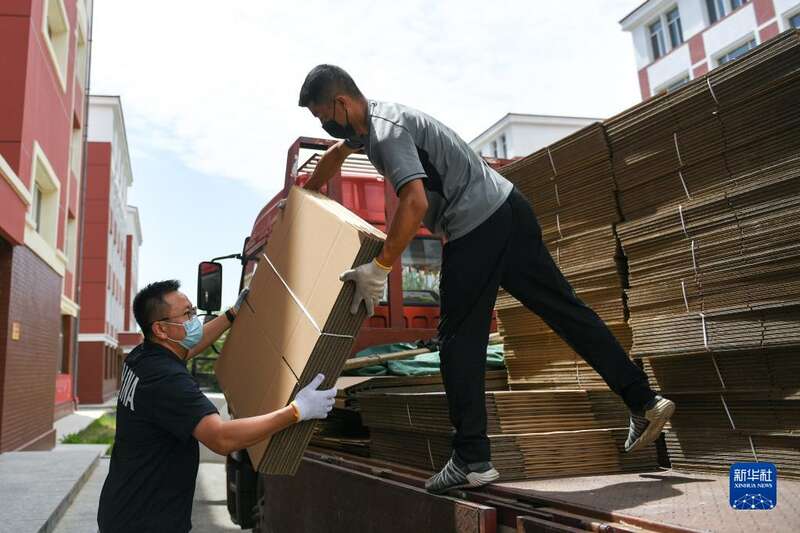 6月18日,在位于呼和浩特市和林格尔县的内蒙古师范大学(盛乐校区)学生公寓外,计算机科学技术学院教师(左)在搬运纸箱板。