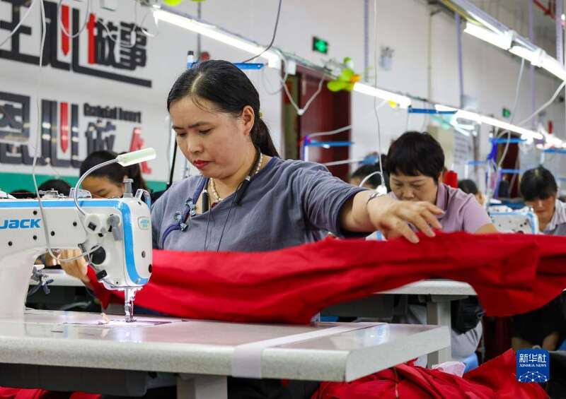 6月18日,搬迁群众在铜仁市万山区丹都街道旺家社区一家服装生产车间加工服装。