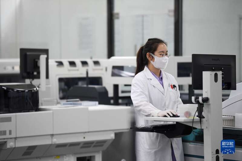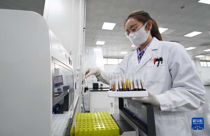 6月17日,在位于秦创原总窗口所在地陕西省西咸新区的西安区域医学检验中心,工作人员将血液样本加入自动化流水线进行归档。新华社记者 李一博 摄