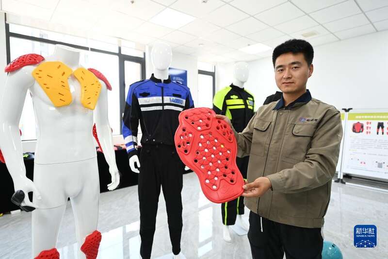 6月17日,在位于秦创原总窗口所在地陕西省西咸新区的陕西拓锐考新材料科技有限公司,工作人员展示自主研发的纳米智能吸能慢回弹护具。新华社记者 李一博 摄
