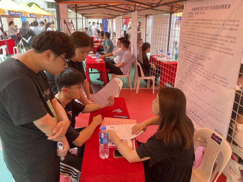 在校园生活区的一处空旷地,两排遮阳棚依次长长摆开,一个棚子里有一家招聘企业。福州金拱门食品有限公司的招聘摊位前一早就围满了学生。