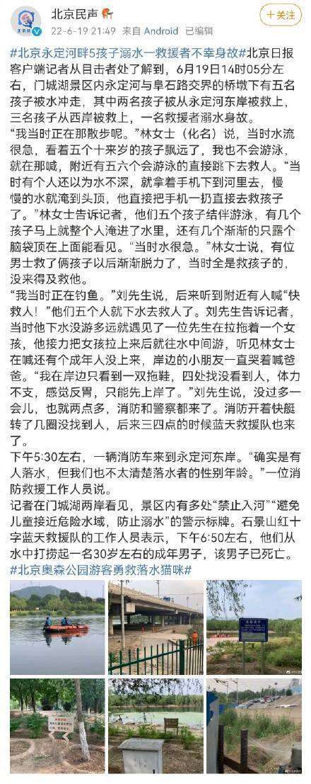 6月19日,北京门头沟区门城湖景区内永定河与阜石路交界的桥墩下,5名孩子被水冲走。
