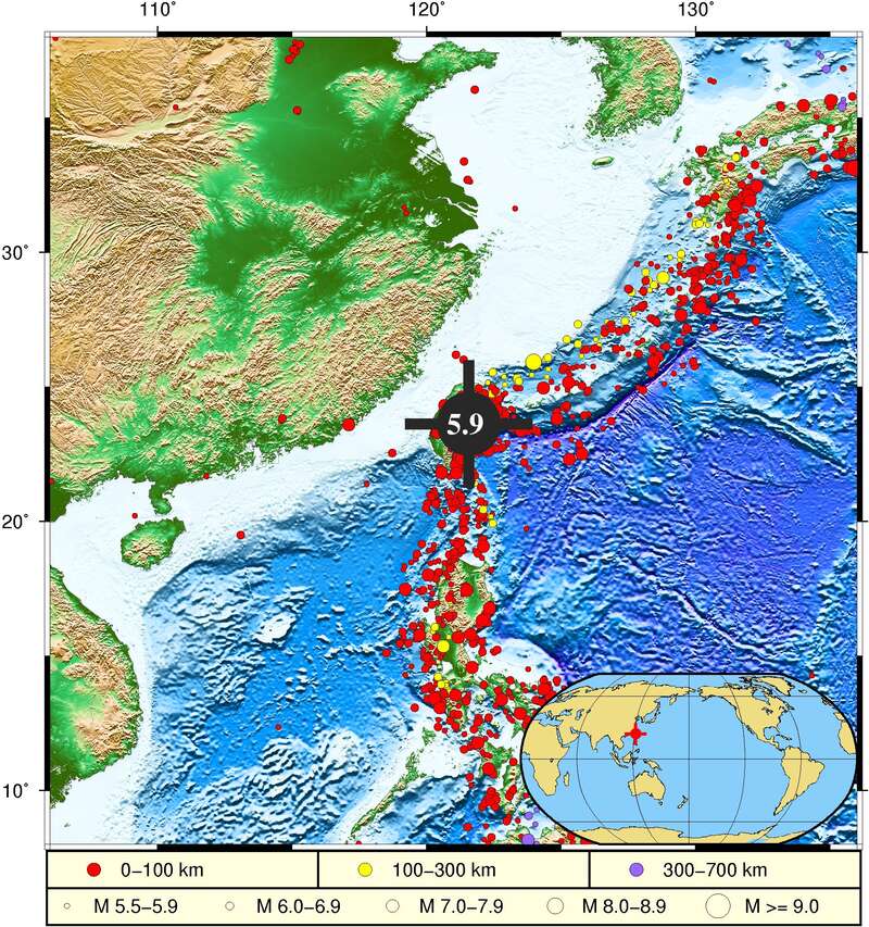 中国青年报客户端北京6月20日电(中青报·中青网记者 李若一)记者今日从国家海洋环境预报中心获悉,2022年6月20日9时5分(北京时间),中国台湾海域(23.61 N,121.56 E)发生5.9级地震,震源深度为15.0千米。自然资源部海啸预警中心根据初步地震参数判断,本次地震不会引发海啸。