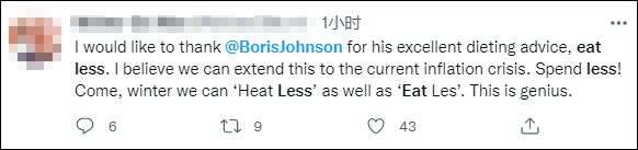 谢谢约翰逊给出这么棒的建议,少吃饭。我们可以把这个思路扩展到当前的通胀危机,少花钱!冬天还可以少取暖。真是个天才。”