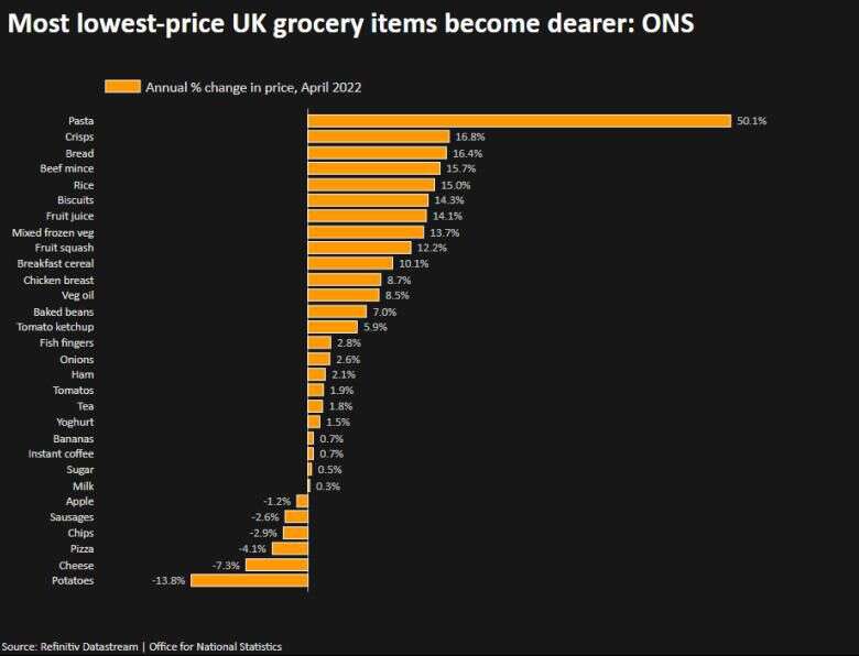 不仅是炸鱼薯条,据英国国家统计局公布的数据,截至今年4月底,意大利面价格在过去12个月内上涨50%,面包、米及薯片平均价格上涨超过15%。