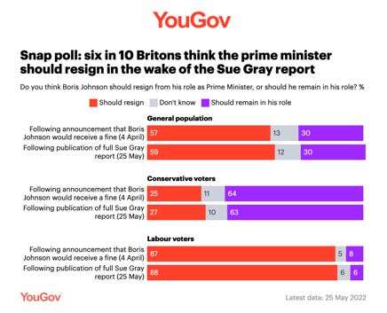 而在苏·格雷公布报告当天,5月25日民调机构YouGov的调查结果显示,有近60%的英国人认为他应该辞职。