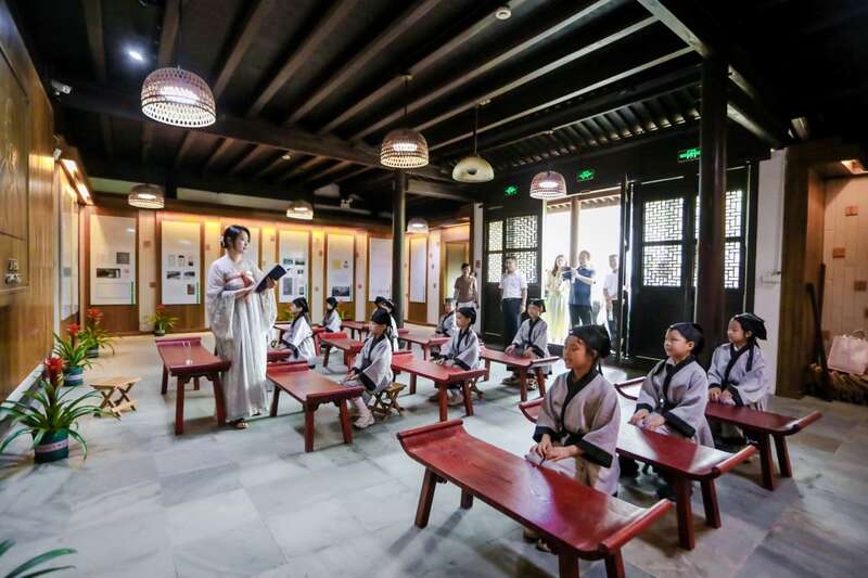 浙江省湖州市安吉县鄣吴镇昌硕故居内,身着汉服的孩子们端正坐姿,认真地听师者传道。(安吉县委宣传部供图)