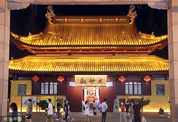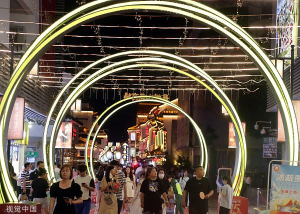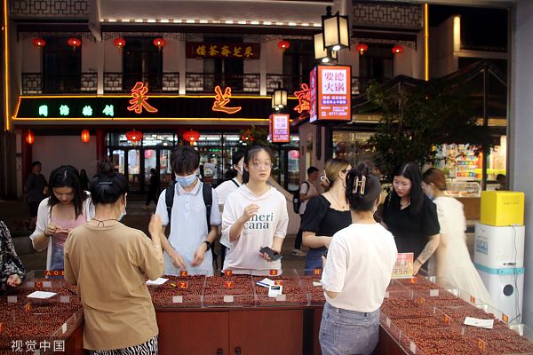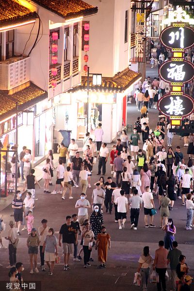 2022年6月20日晚,市民在江苏苏州观前商业街逛街购物,感受夏夜经济复苏的活力。近日,观前商业街“烟火气”有序回归,人们有序逛街、购物,观前街旅游稳步复苏回暖。