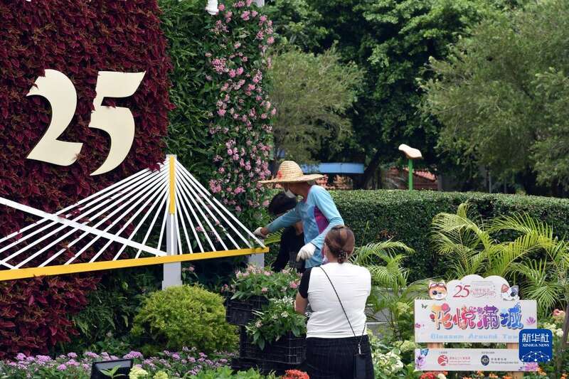 6月20日,工作人员在香港荃湾公园布置庆祝香港回归祖国25周年花圃。