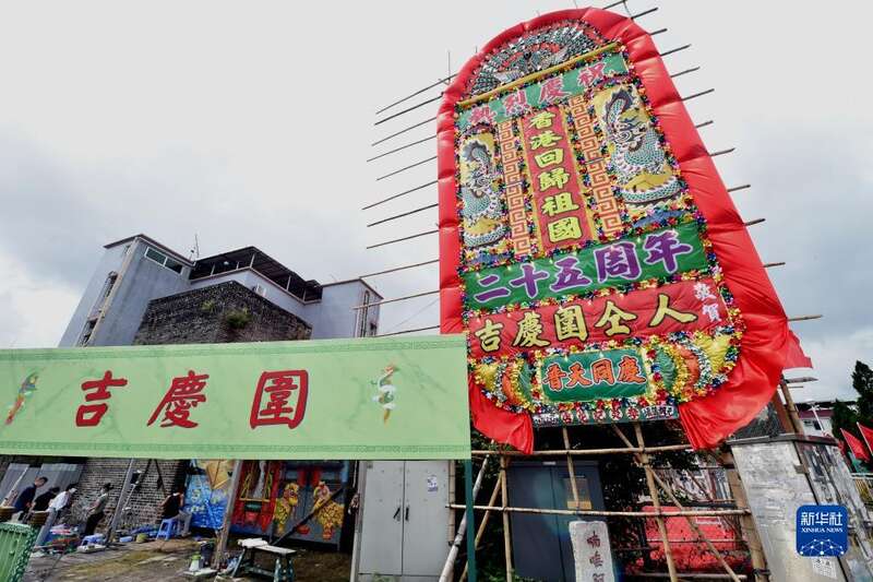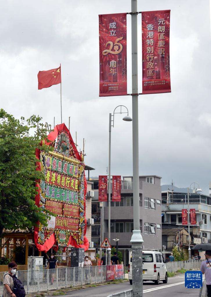 6月20日,香港吉庆围挂上庆祝香港回归祖国25周年花牌。