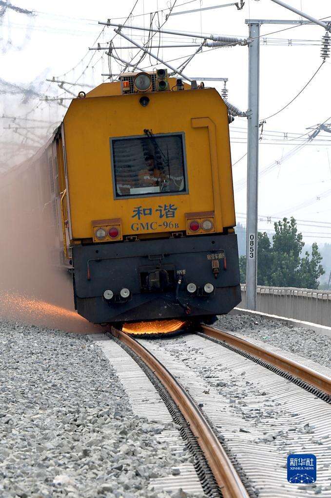 一辆钢轨打磨车在郑渝高铁河南段的一处弯道作业(2019年7月18日摄)。