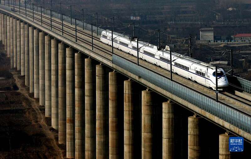 一辆试运行的“和谐号”列车经过郑西高铁河南三门峡市境内的一座高架桥(2010年1月16日摄)。