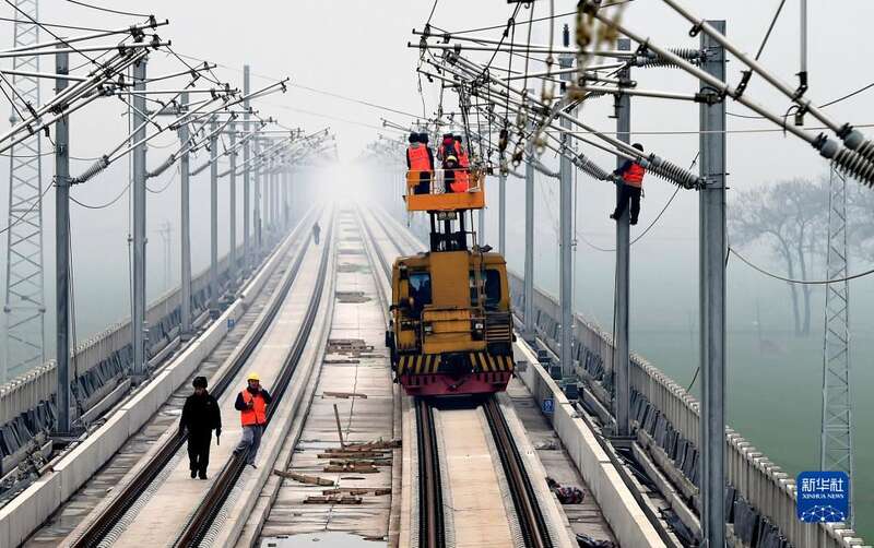 中铁电气化局集团三公司的工作人员在工程车上架设郑徐高铁接触网导线(2015年12月7日摄)。