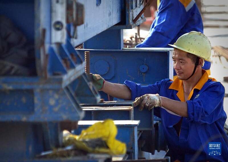 施工人员在郑阜高铁先开段跨商周高速连续梁施工现场作业(2017年8月15日摄)。