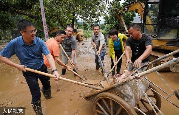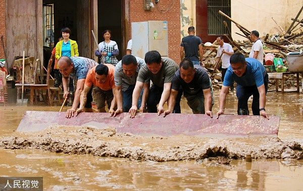 2022年6月20日,广西融水,苗族自治县部分街道、村庄、农田受暴雨影响被淹,该县纪检监察干部既督又战,与党员干部深入洪灾一线,清淤泥、运垃圾、洗家俱等,力争将因灾造成的损失降为最低。