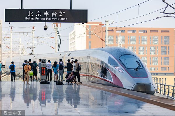 2022年6月20日,北京,丰台站正式开通运营,车站设有32条到达出发线,32个客运站台面。图为北京市丰台站首发高铁G601次列车。