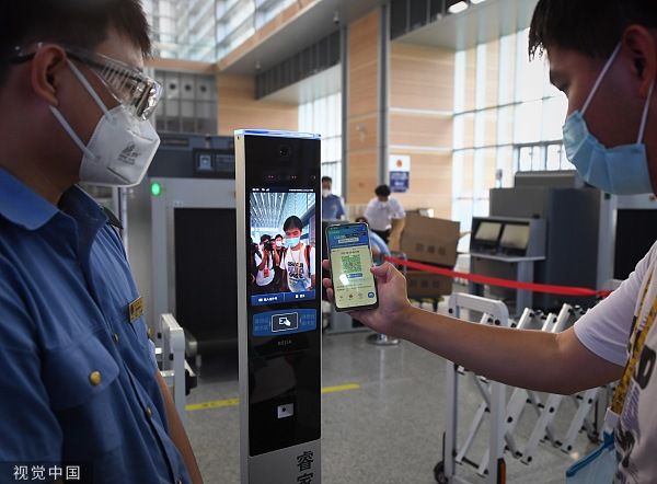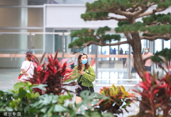 2022年6月20日,经过4年的改扩建,百年老站北京丰台站以全新面貌开通运营。图为进站旅客被一处花坛绿植吸引。 中新社记者 贾天勇 摄